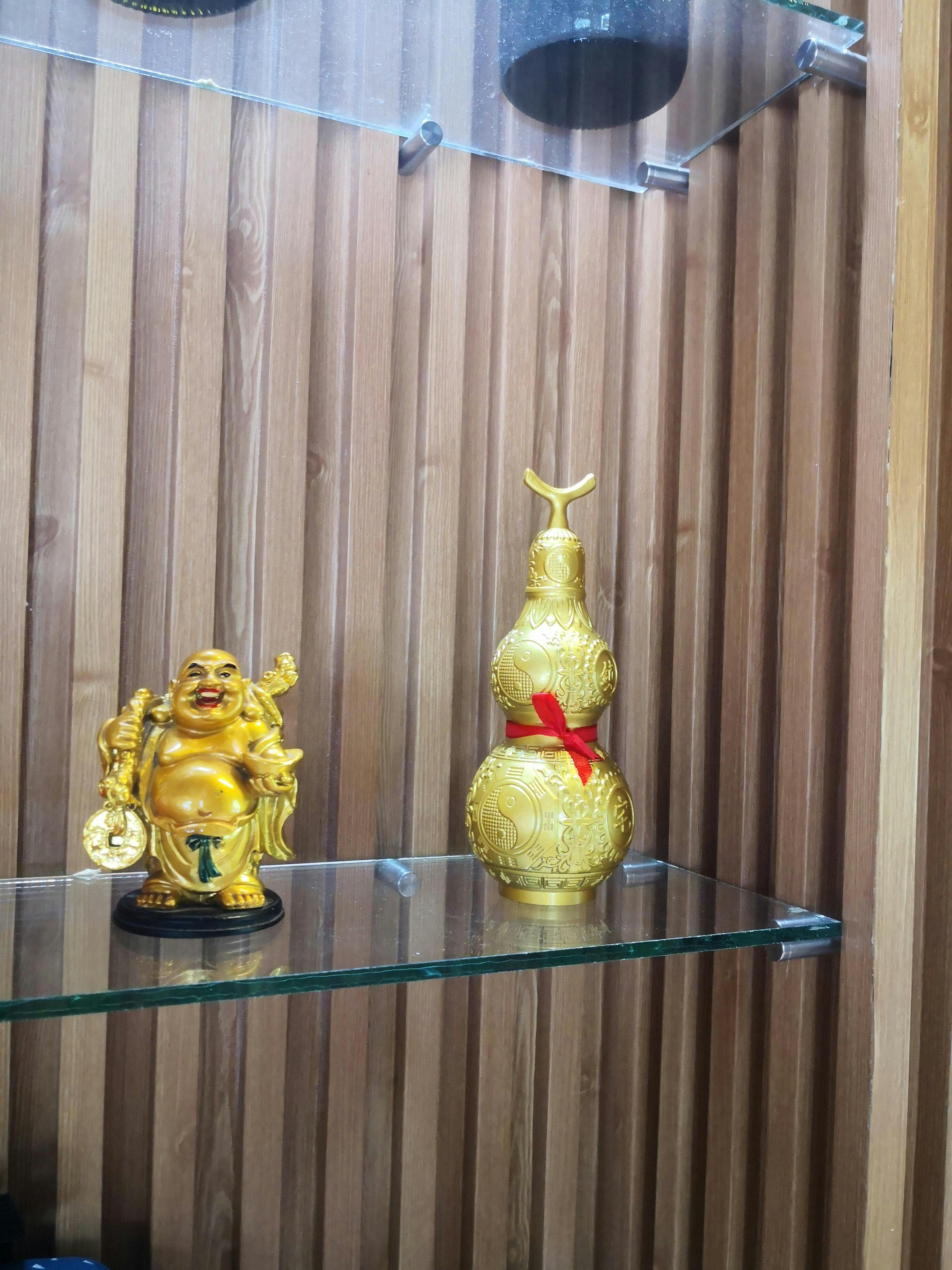 A traditional brass Wu Lou gourd with engraved blessings — placed to guard health, absorb illness, and bring vitality into the home or workspace.